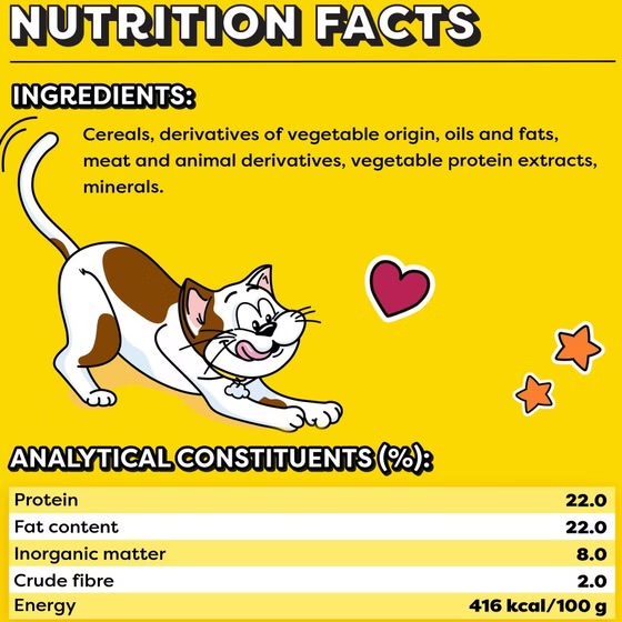 پروتئین 22%، فیبر خام 2%، چربی 22%، انرژی 408 کیلوکالری
